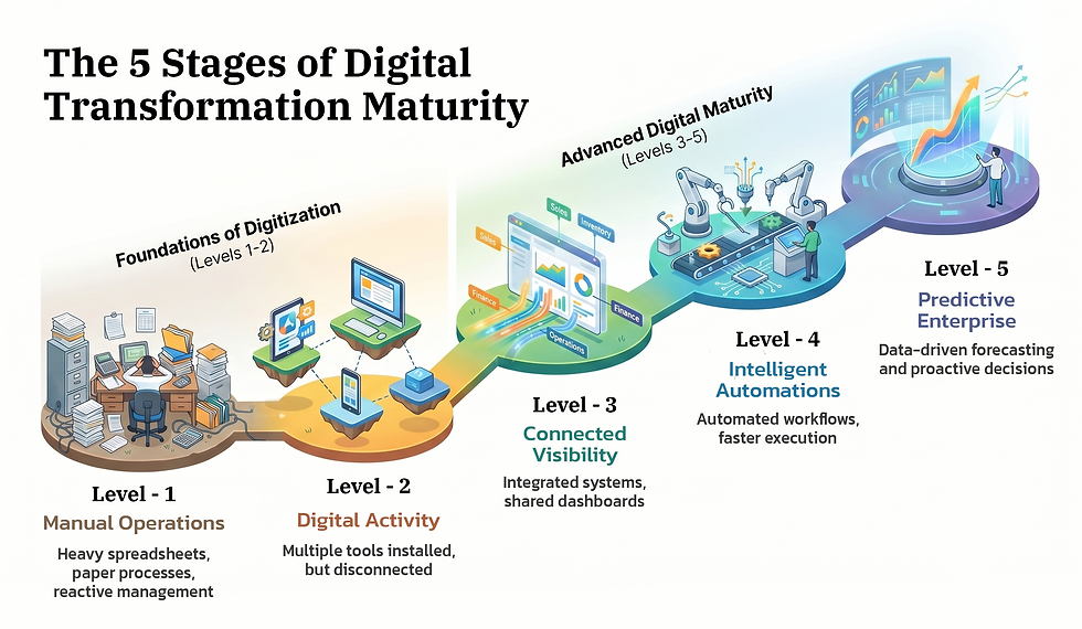 Many businesses move from Level 1 to Level 2 and stop there. They adopt tools but not transformation. This creates a dangerous illusion of progress.